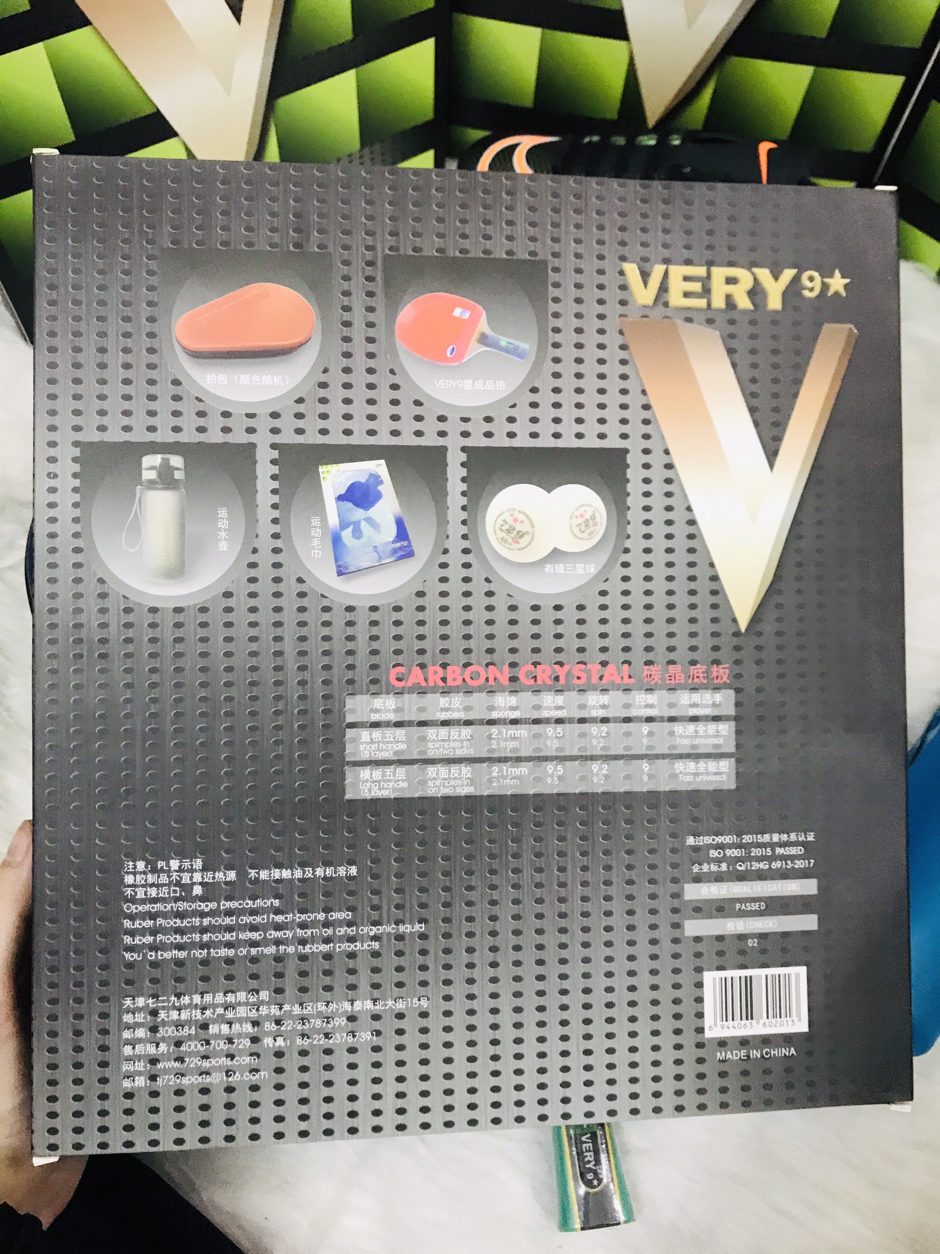*Vợt bóng bàn phù hợp với lối chơi nhanh, đánh tốc độ. Vợt bóng bàn 729 Very 9 sao đạt chứng nhận theo tiêu chuẩn ITTF (Liên đoàn bóng bàn thế giới) sẽ đáp ứng tiêu chuẩn thi đấu và tập luyện *Vợt bóng bàn thiết kế một mặt đen và một mặt đỏ. Cán vợt được làm từ gỗ tự nhiên dày 5 lớp, cầm nắm vừa tay, chắc chắn. *Vợt bóng bàn 729 có chiều cao toàn vợt là 24.3cm, chiều cao tay cầm là 9.3cm, chiều rộng là 14.6cm, độ dày mặt vợt là 1.3cm. Thông số kỹ thuật của vợt bóng bàn 729 Very 9 sao - Mặt vợt đỏ 729-08: Speed: 8.6 Spin: 9.1 Tackiness: 7.1 Overall: 8.9 Ratings: 21 - Mặt vợt đen 729-40s: Speed: 7.4 Spin: 7.4 Tackiness: 7.0 Overall: 7.9 Ratings: 8.0 Tấm dưới cùng: Carbon